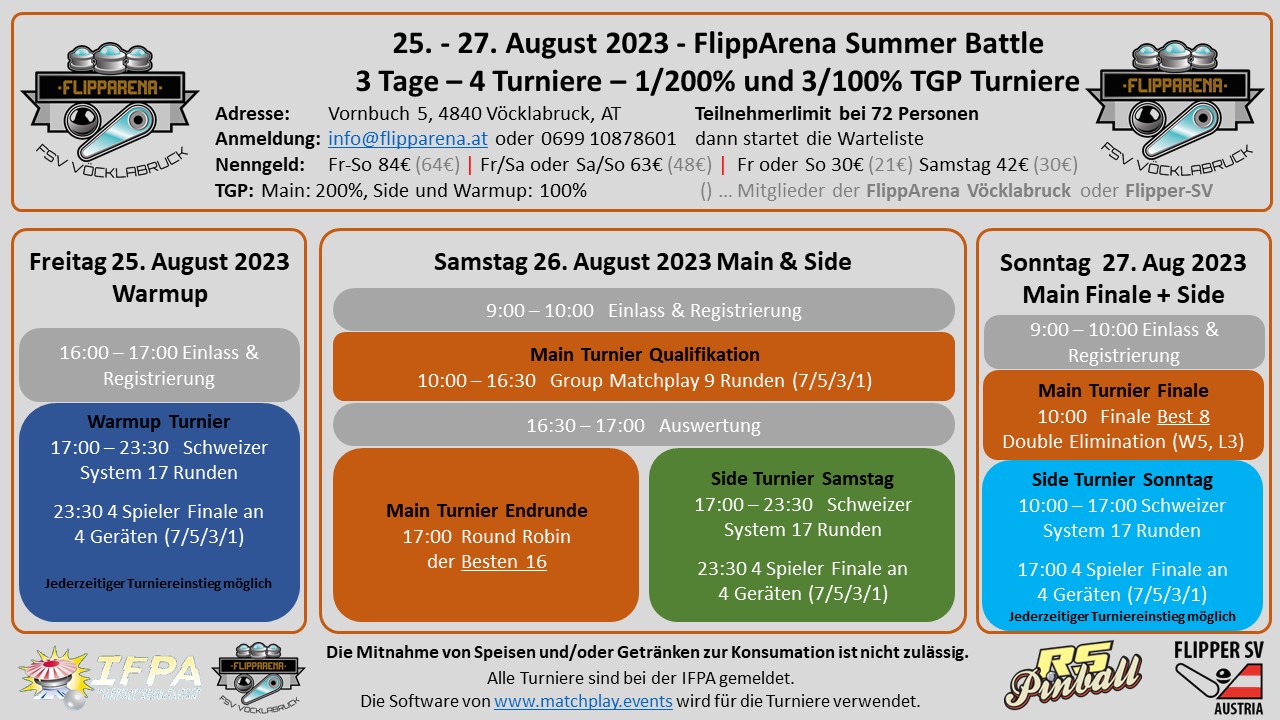 Liebe Freunde der Flipperkugeln, der Vöcklabrucker FlipperSportVerein – FlippArena organisiert sein erstes 3 Tage Flipper Event mit in Summe 4 Turnieren und der Flipper-SV unterstützt seine Mitglieder –